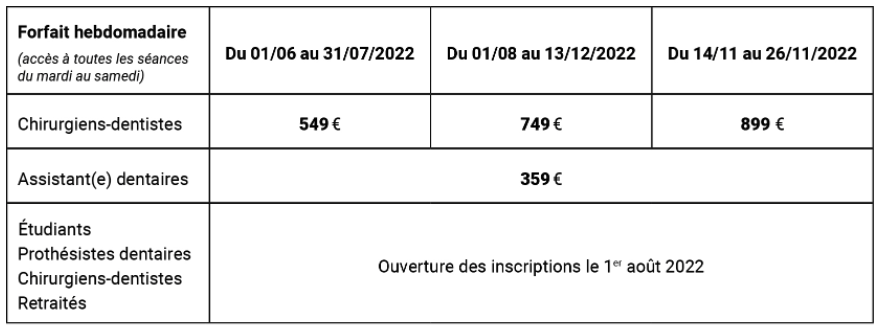 - une inscription générale obligatoire, le forfait, qui donne accès à l’ensemble des séances. Le forfait comprend, outre la visite de l’Exposition, un sac Congrès et les Dossiers de l’ADF de l’année.